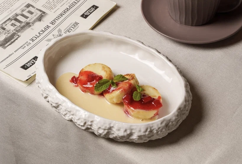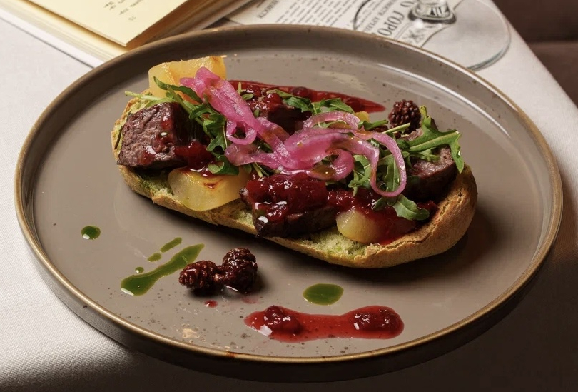 Теплая бриошь с говядиной и персиком с брусничным соусом на сосновых шишках
