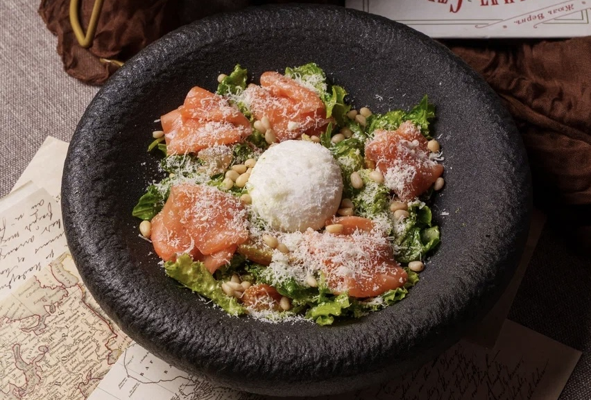 Красная рыба, черри, микс салата , кедровый орех, пармезан , соус песто