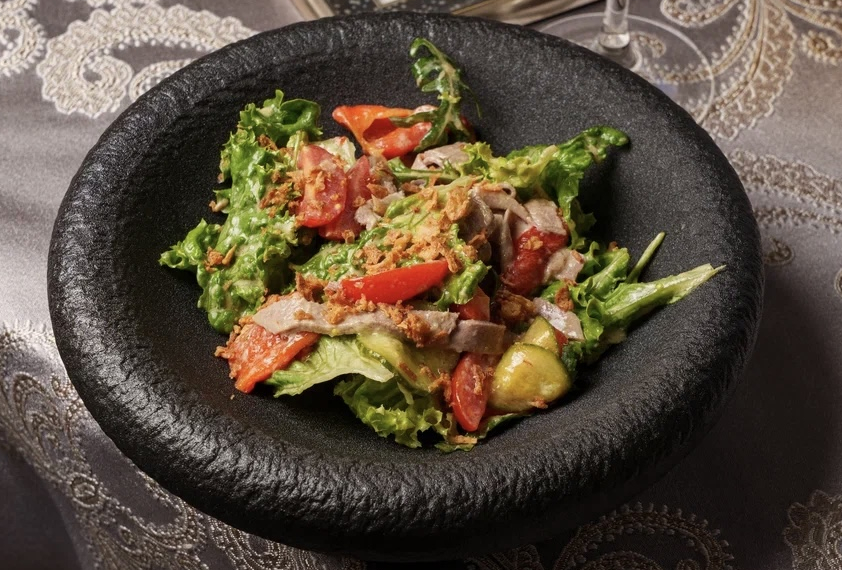 Говядина, микс салата , черри, шампиньоны, картофельные дольки, тандем имбирного и трюфельного соуса.