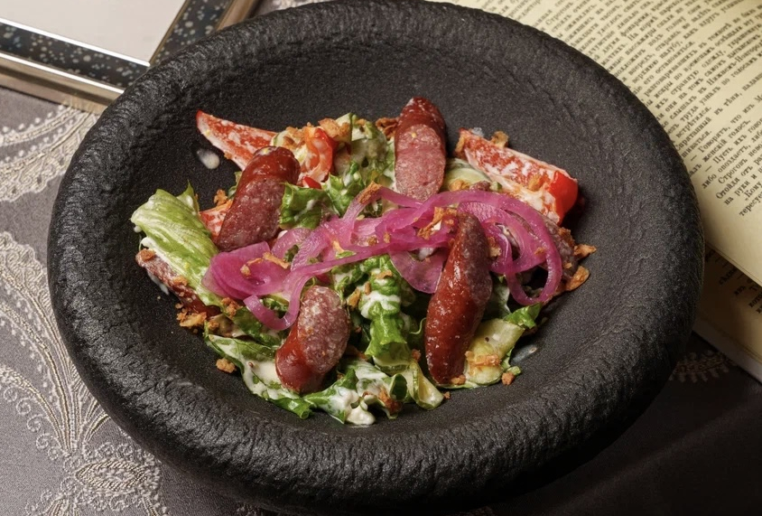 Говядина, свежий и маринованный огурец, картофель, опята, домашний майонез .
