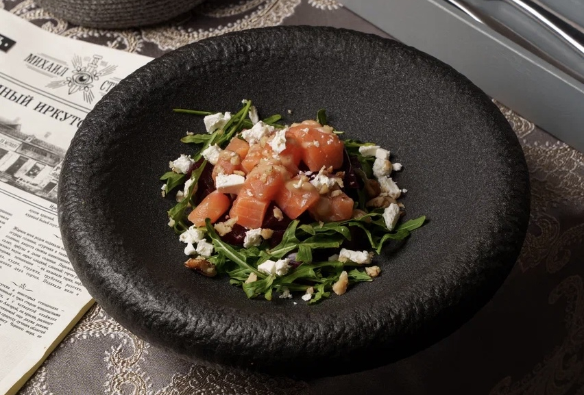 Руккола, крошка феты, имбирная заправка, грецкий орех