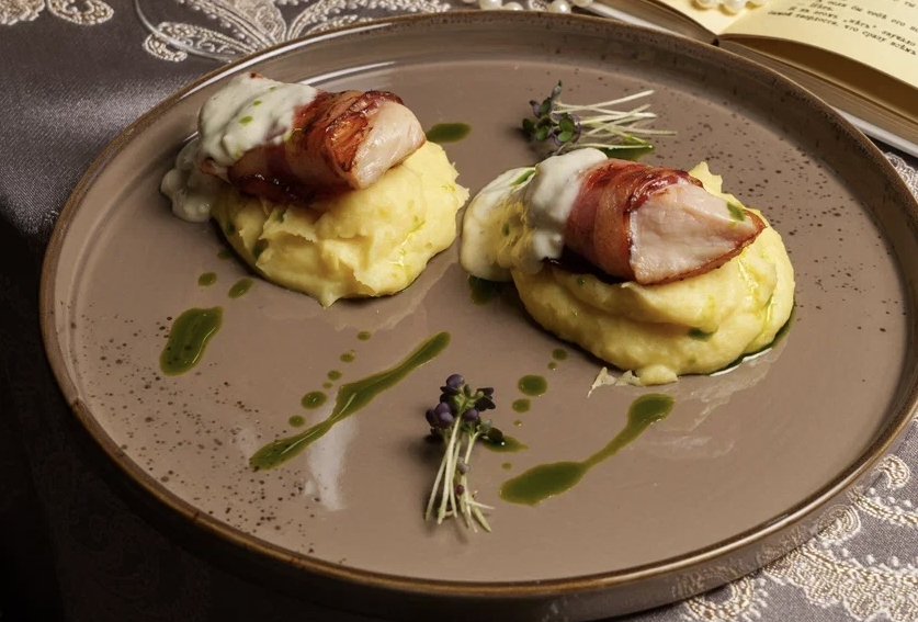 Рулеты из курицы в беконе с картофельным пюре и кремовым соусом из горгонзолы