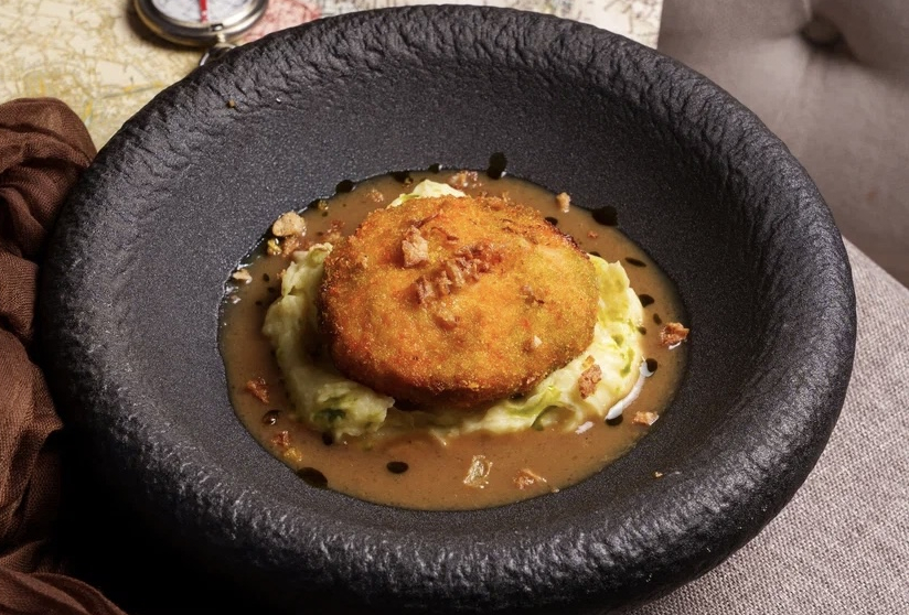 Куриная котлета с трюфельным картофельным пюре и луковым демигласом
